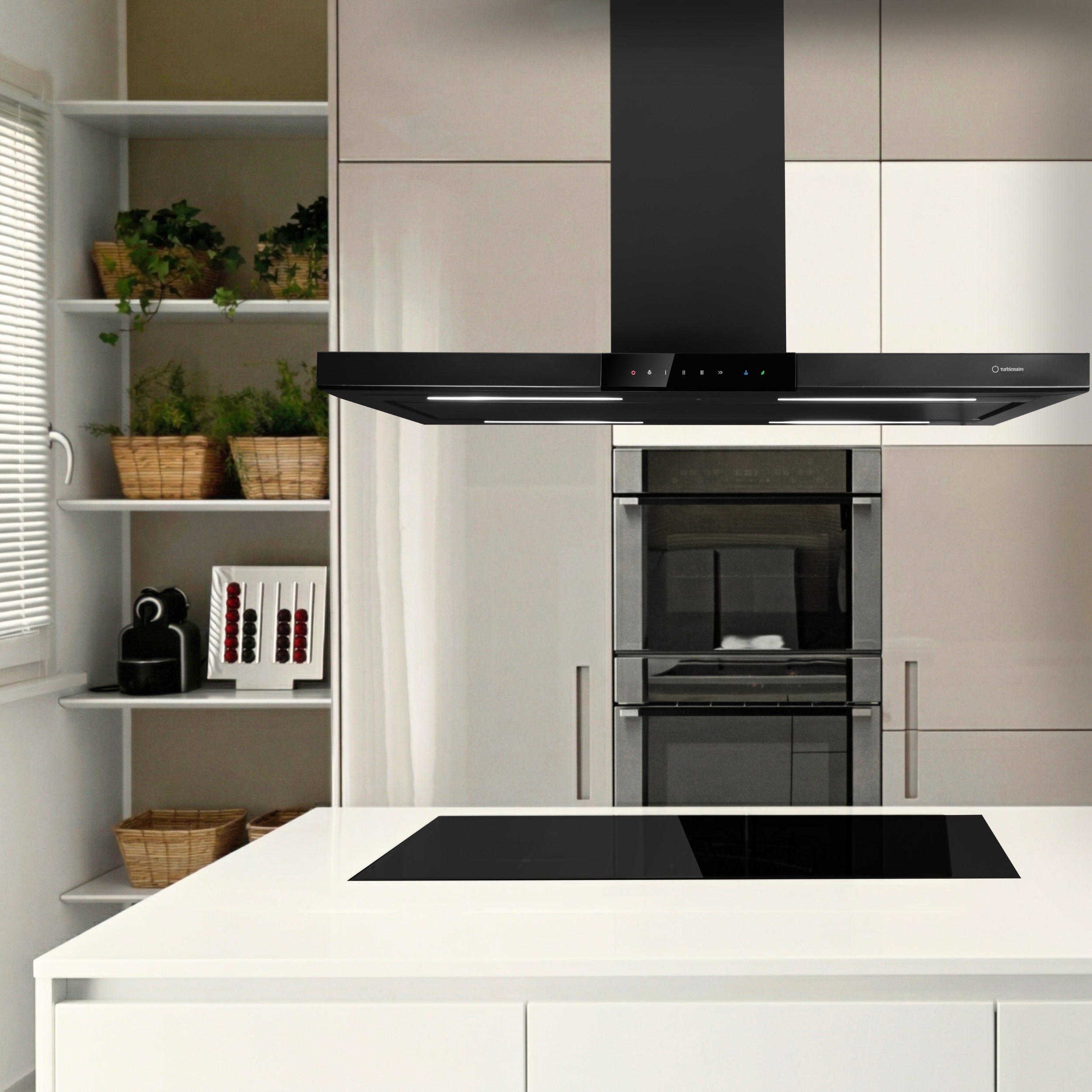 The ELVA 120 Island, with its bold matte black finish, becomes a striking centerpiece in any kitchen. Designed for island installations, it features a powerful motor, Air Cleaning Mode, and a Temperature Monitoring Sensor for enhanced comfort. The SuperBoost function rapidly eliminates steam and odors, while energy-efficient LED lighting and intuitive electronic controls create a bright, fresh, and modern kitchen atmosphere.